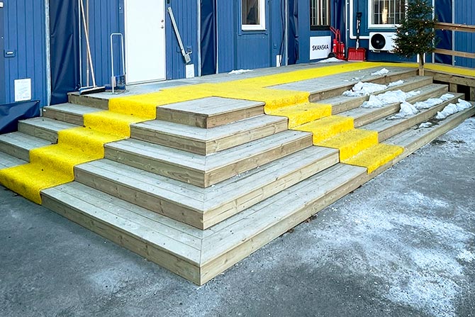 SafetyMats brukes både innendørs og utendørs på områder med høy gangtrafikk for å redusere risikoen for glatt føre og minimere slitasje. De egner seg spesielt godt for gangsoner og inngangspartier på byggeplasser, kontorer og i offentlige miljøer. Hver matte er én meter bred og ti meter lang. Mattene leveres på rull for rask og enkel utlegging. Mattene kan enkelt tilpasses med kniv for perfekt passform.