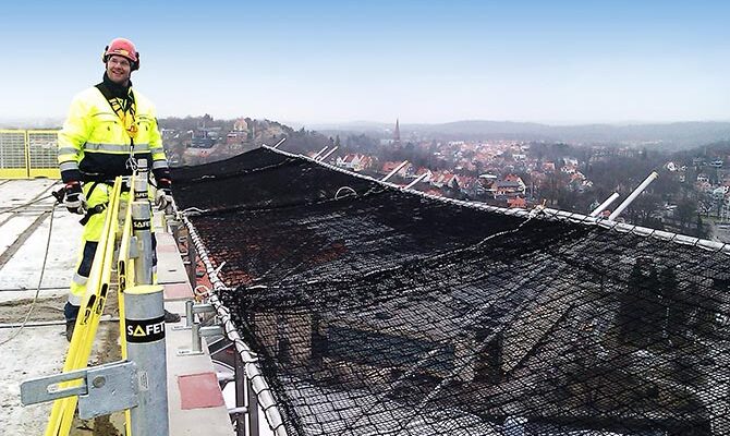 SafetyRespect Sikringsskjermsystem for vegg er et suplement til vårt ordinære fallsikringssystem og anvendes for å fange opp fallende materialer og gjenstander (ikke person), som kan innebære risiko for skader på personer eller elementer. Dette systemet er anpasset for å monteres på en vertikal overfalte uten behov av løftekran og med ordinær fallsikring montert frittstående på arbeidsyten.